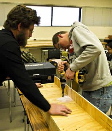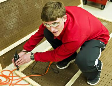Ben Schilling works on the robot’s pit stop enclosure for the upcoming competition in Salt Lake City. Photo by TK Thompson/ladailyposttest.ortizaudio.net