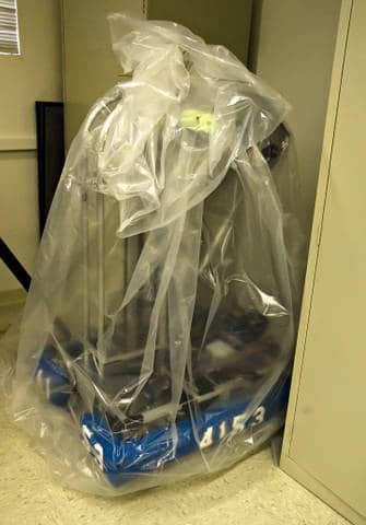 The Los Alamos robot now lives in a locked bag. The robot was placed in the bag at midnight Feb. 21 when all work had to be completed. Photo by TK Thompson/ladailyposttest.ortizaudio.net