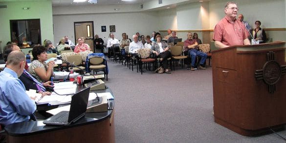 Los Alamos Municipal Court Judge Alan Kirk at the podium and, from left, Councilor Mike Wismer and Councilor Ron Selvage. Photo by Carol A. Clark/ladailyposttest.ortizaudio.net