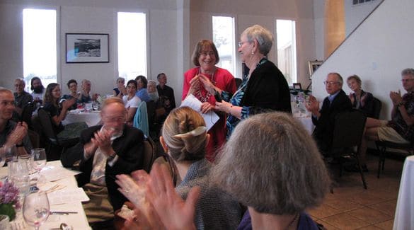 Applause rang out for Pajarito Environmental Education Center Board President Becky Shankland, left, and Board Vice-president and Earth Day Chair Teralene Foxx during the PEEC Party to Benefit Nature Programs held Sunday evening at the Best Western Hilltop House Hotel. Photo by Carol A. Clark/ladailyposttest.ortizaudio.net