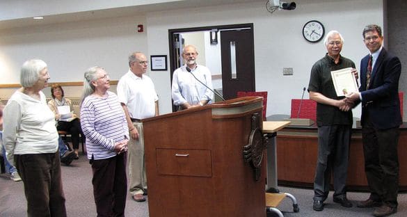 Councilor David Izraelevitz presented on behalf of the Council a proclamation to members of the Los Alamos Homestead Tour Planning Committee declaring the week of May 13-20 as “Homestead Commemoration Week” in Los Alamos and in celebration of the kick-off for the Los Alamos Homestead tour. Photo by Carol A. Clark/ladailyposttest.ortizaudio.net