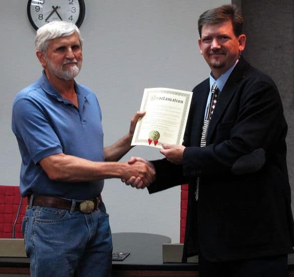 Councilor Vice Chair Ron Selvage, right, on behalf of the Council, presents a proclamation to Ron Wilkins of the Los Alamos Historical Society declaring the Month of May as “National Preservation Month” in Los Alamos County. Photo by Carol A. Clark/ladailyposttest.ortizaudio.net