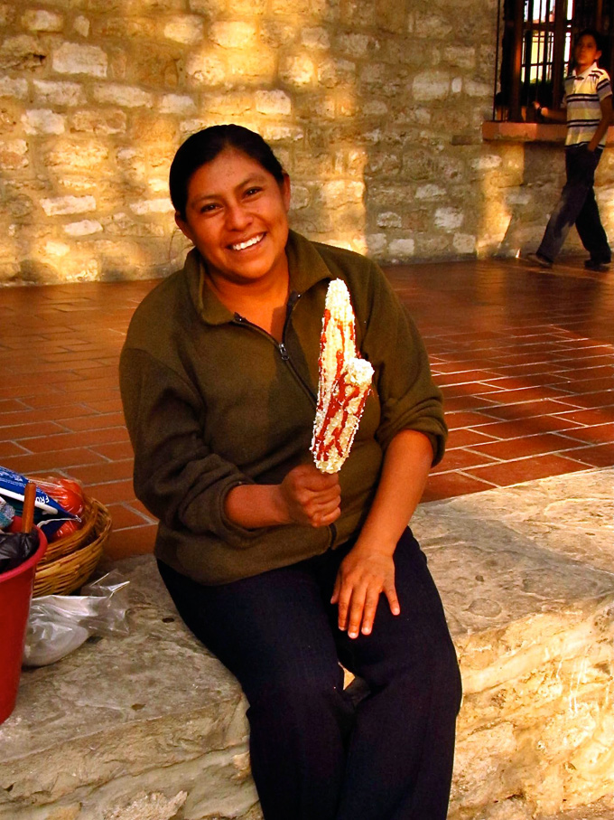 A friendly corn vender. Photo by Sherry HardageA few blocks from the Zócalo is a church frequented by local indigenous people. Its large plaza is the center of many celebrations and fairs. Iglesia de San Caralampio is painted bright yellow and almost always filled with the sweet scent of thousands of flowers.
