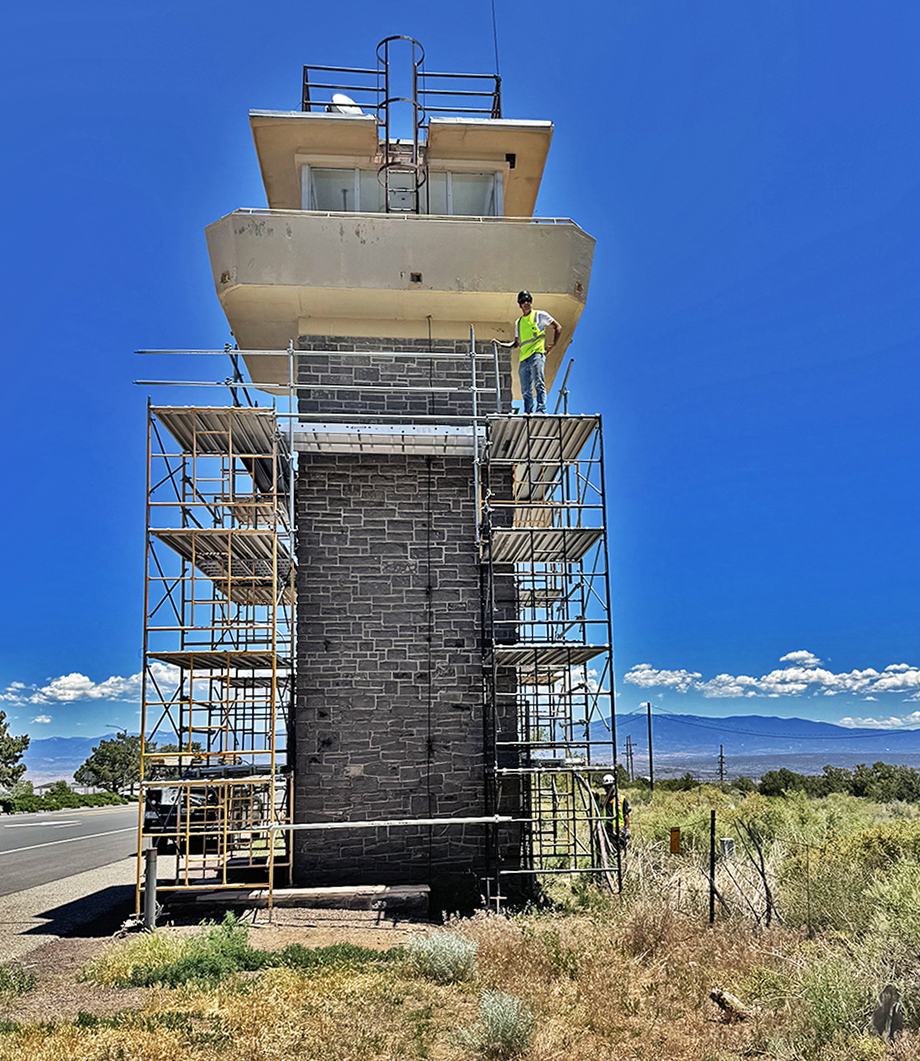 The historic East Gate Guard Tower is undergoing maintenance as part of Los Alamos National Laboratory’s commitment to maintaining structures throughout the Lab campus in accordance with historical specifications. The maintenance includes masonry repairs to flooring, exterior walls and stairs as well as reattaching some of the handrails for safety and reattaching a panel cover. The tower will be re-roofed at a future date. Photo by John McHale/ladailyposttest.ortizaudio.net
