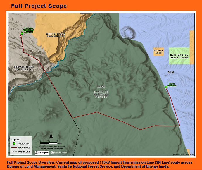 The EA analyzed the construction and operation of a new 115 kilovolt (kV) power transmission line to upgrade LANL’s existing electrical infrastructure. Electrical power supply forecasts project that existing transmission lines serving LANL and Los Alamos County will reach capacity in 2027. This jeopardizes the electrical power supply necessary to meet mission requirements.