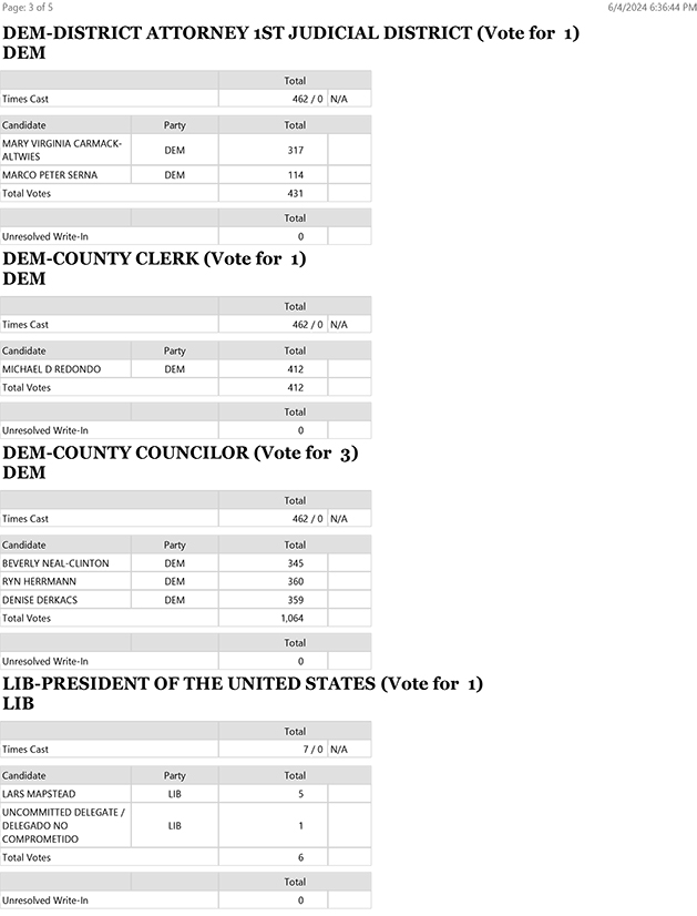 Los Alamos County Poll Worker Ed Santiago, left, and Los Alamos County Clerk Naomi Maestas, right, in Council Chambers as voting in the 2024 Primary Election comes to a close at 7 p.m. today. Watch ladailypost.com all evening for election results and live streamed interviews with the candidates. Photo by Carol A. Clark/ladailypost Read More