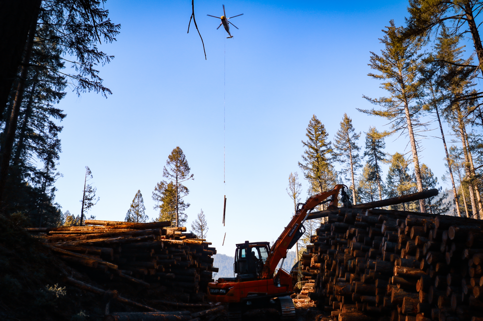Helicopter logging is a critical resource for reducing stand density across the significantly overgrown North Yuba project area. Bringing forests back to a more resilient state will allow trees to grow larger and healthier, reduce wildfire risk and improve wildlife habitat. Photo by Lauren Faulkenberry/Forest Service