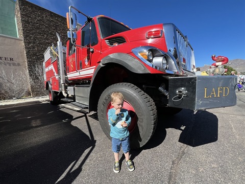 Attendees can explore LAFD and Los Alamos Police Department emergency vehicles and equipment, participate in a bicycle‑helmet fitting, and see a Classic Air Medical helicopter up close.