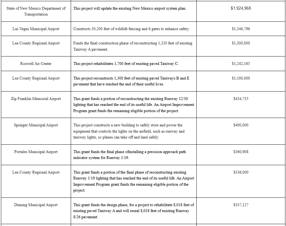 Other airports that also received funding include Lea County Regional Airport, Lordsburg Municipal Airport, Crownpoint Airport, Springer Municipal Airport, Carrizozo Municipal Airport, Andrew Othole Memorial Airport, Artesia Municipal Airport, Portales Municipal Airport, Deming City Airport, Clayton Municipal Airport, Roswell Air Center, Hatch Municipal Airport, and Las Vegas Municipal Airport.