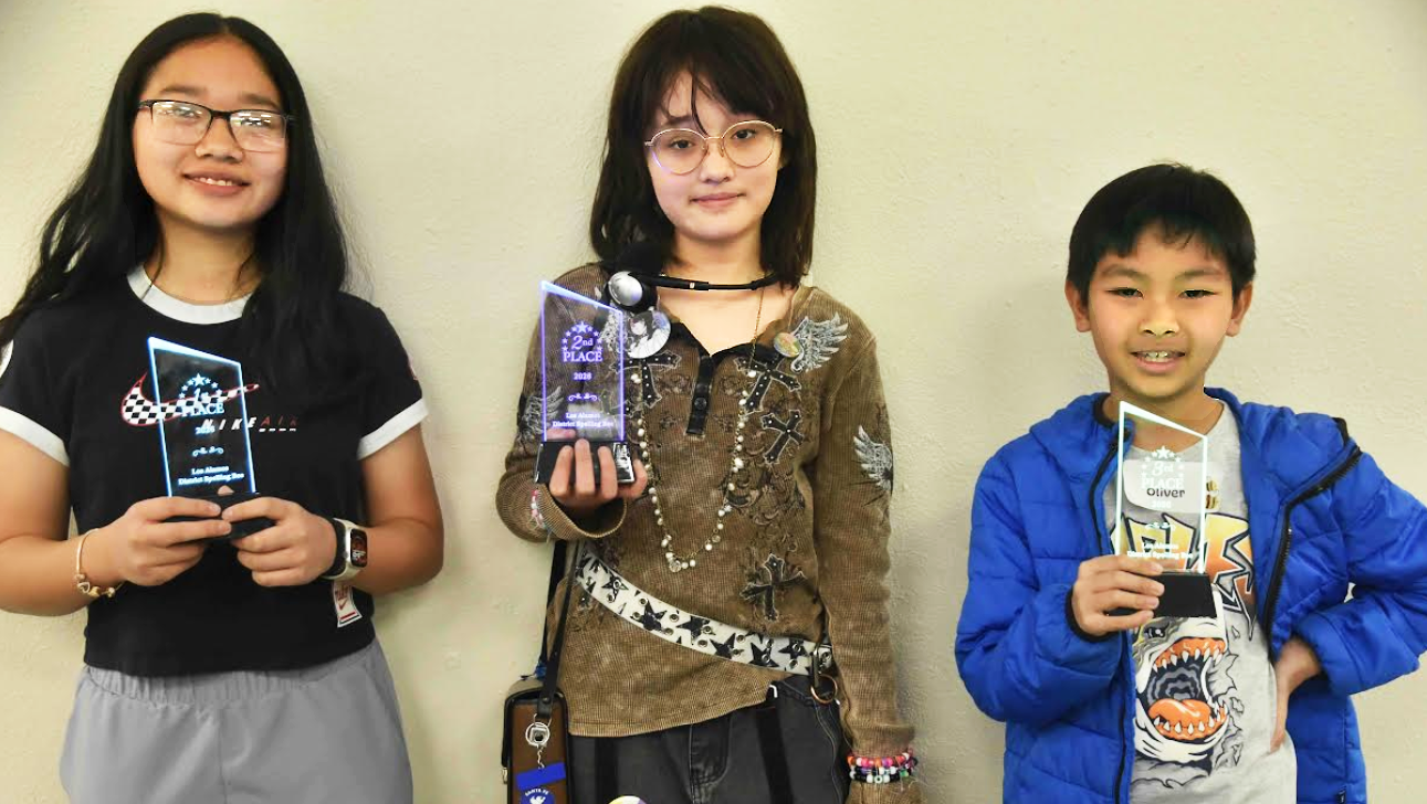 2026 LAPS District Spelling Bee winners from left, Hannah Li, 1st place; Fynn Johnson, 2nd place; and Oliver Truong, 3rd place. Li and Johnson will represent LAPS at the New Mexico State Qualifying Spelling Bee at the end of February. Courtesy/LAPS