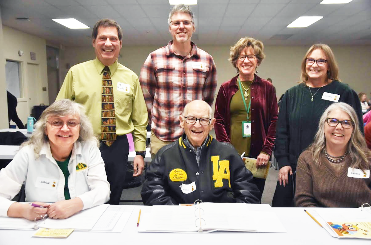 Volunteers for this year’s District Spelling Bee include, front row from left, judges Debbie Grothaus, Morrie Pongratz and Sondra Wymanback, and back row from left, Jeff Favorite, pronouncer; Jonathan Richardson, coordinator; Nancy Brugh, emcee/recordkeeper and Tammy Hinckley, timekeeper. Courtesy/LAPS