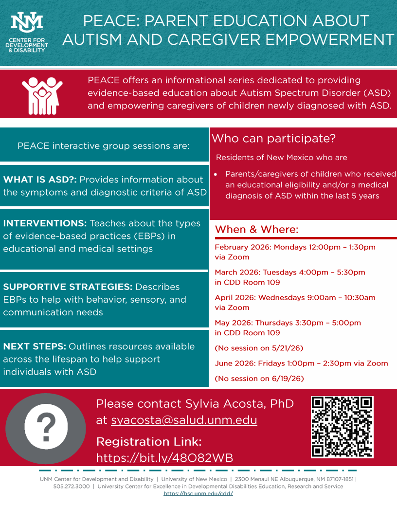 The Parent Education about Autism and Caregiver Empowerment (PEACE) training at the Center for Development and Disability is an educational training series for parents and caregivers of children with a recent diagnosis of Autism Spectrum Disorder (ASD).