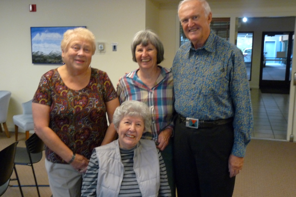 From left, hostess Frances Kendall, Ann Wells, Moderator Bob Wells and Mary Ella Buckland at Oppenheimer Place during Saturday’s candidates chat. Photo by Don Kendall/ladailyposttest.ortizaudio.net