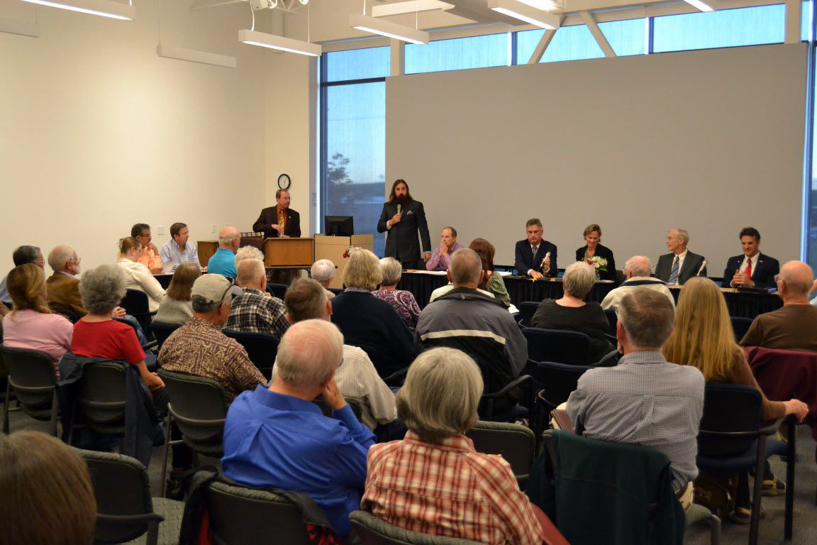 Los Alamos County Council candidates participated in Thursday’s Chamber/Monitor forum that focused on business and economic issues. Monitor Publisher Keven Todd moderated the event and LACDC/Chamber Board Member Stan Primak and Monitor Editor John Severance questioned the candidates. Photo by Kevin Holsapple
