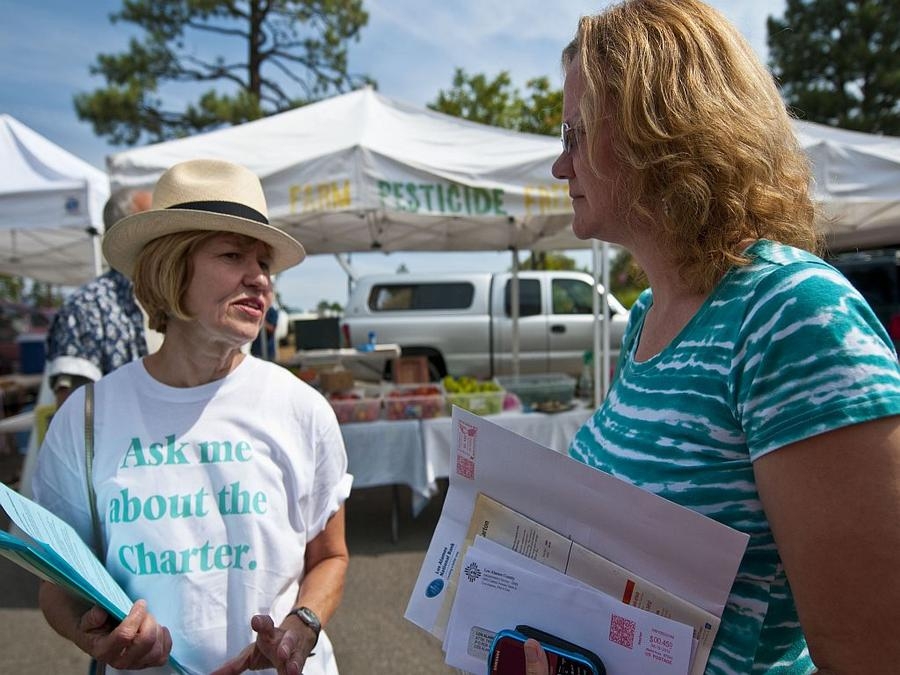 Chris Chandler, left, discusses charter amendments with Heather McClenahan at a recent Farmer’s Market. Photo by Greg Kendall/ladailyposttest.ortizaudio.net