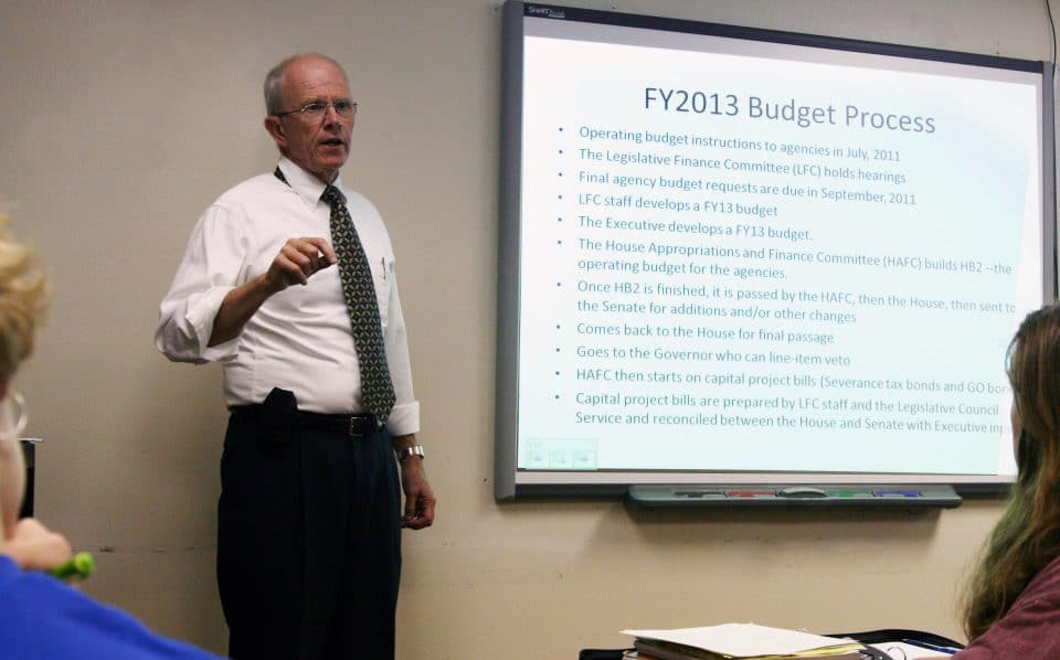 UNM-LA guest lecturer Dist. 43 House Rep. Jim Hall presented to County Councilor Mike WIsmer’s American Politics Class Monday night, an overview of the 2012 Legislative Session focusing on basic state finances, the legislative budget process and outcomes and a lecture describing the recent redistricting process. See presentations at jimhallnm43.com. Photo by Mandy Marksteiner  Read More