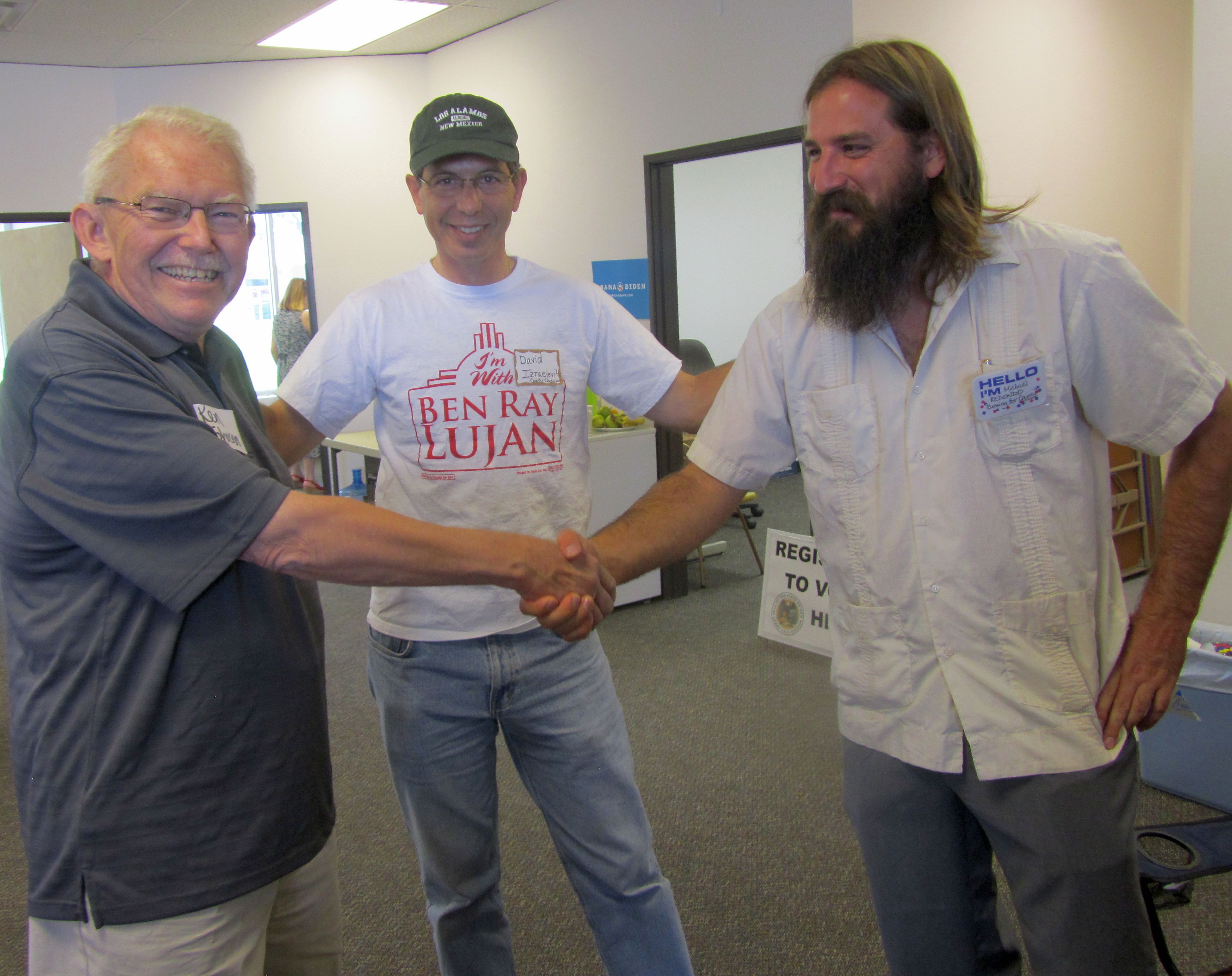 County Councilor David Izraelevitz, center, introduces former council candidate Ken Johnson, left, to his replacement Michael Redondo, who as a hobby, is an extra in movies requiring him to wear his hair and beard long. Johnson resigned from the race last month because he is likely moving out of town. The introduction of Johnson and Redondo was made Sunday as the Democratic Party of Los Alamos County officially opened its new headquarters in downtown Los Alamos with a grand opening celebration. A crowd of Democrats mixed with some Republicans and Independents filled the large space at 140 Central Read More