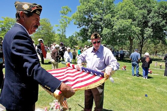 Victor Valenzuela, Commander of VFW Post 8874, and Jack Boyd roll up their flag after the Memorial Day Ceremony at Guaje Pines Cemetery. Photo by Salvador Zapien