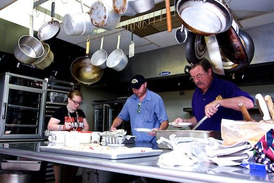 Dick Bjarke, at right, and aids prepare plates for the Memorial Day Lunch at the Elk’s Lodge. Photo by Salvador Zapien