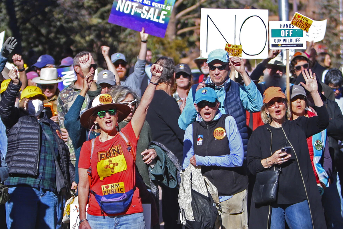 Demonstrators cheer and hold up signs during a public lands rally on Friday, Feb. 6, 2026, outside of the state Capitol. Matt Dahlseid/The New Mexican