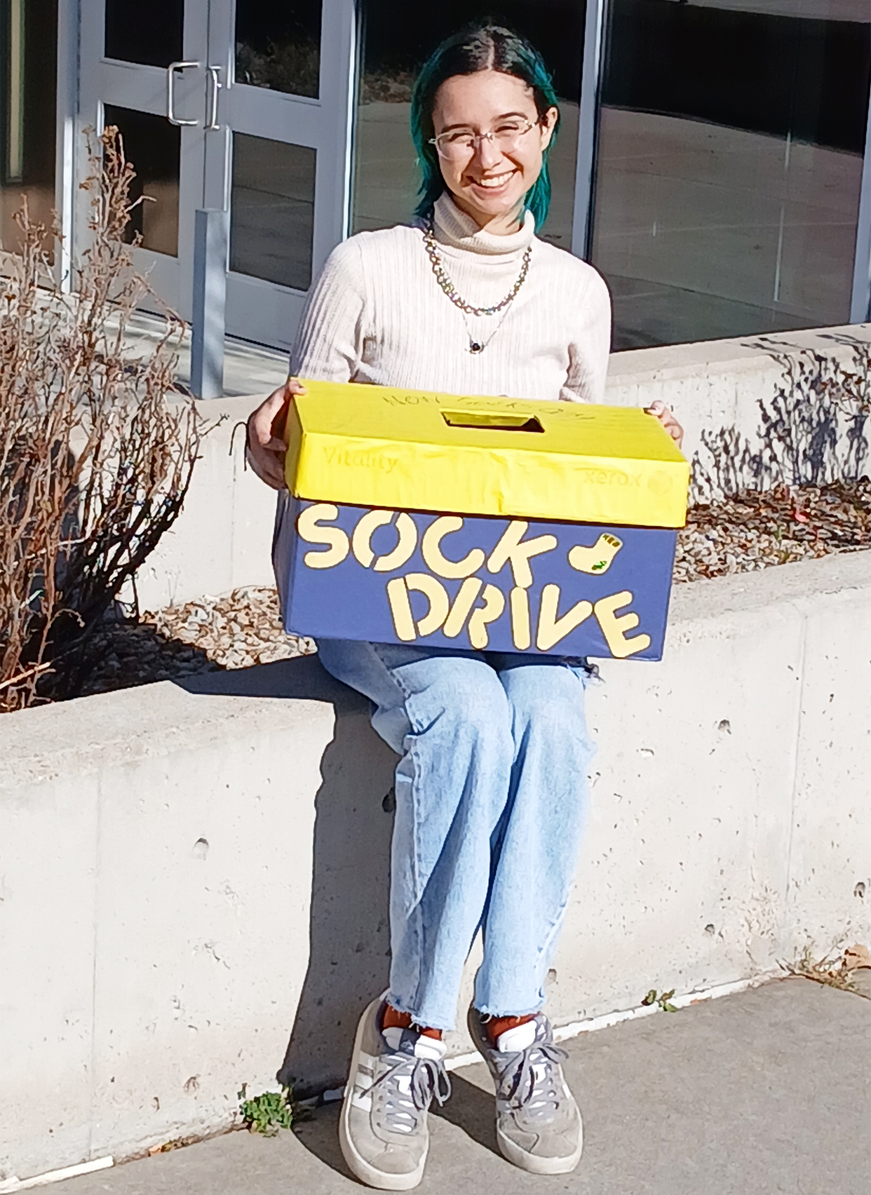 Los Alamos High School DECA President Jasmine Heft displays a collection box for the DECA Sock Drive. Courtesy/LAHS