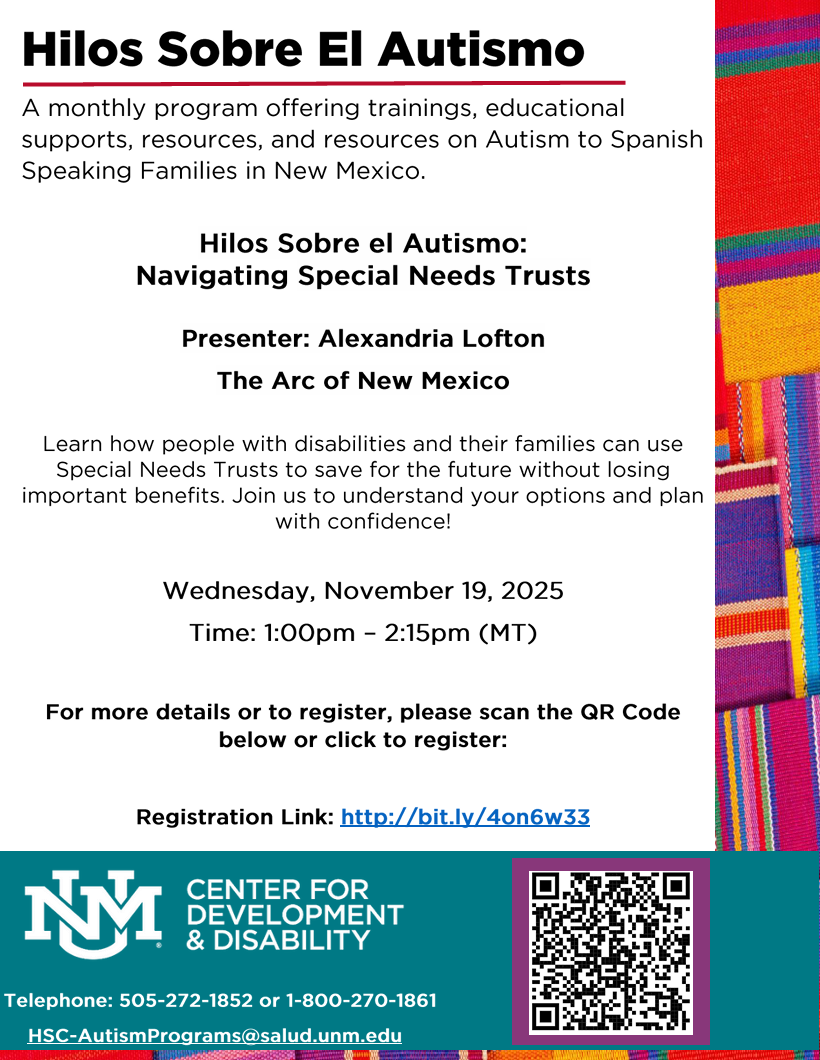 Hilos Sobre el Autismo is a monthly virtual program offering trainings, educational supports, and resources on autism to Spanish-Speaking families in New Mexico.