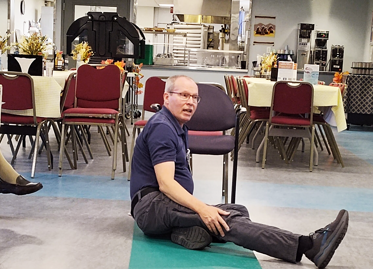 Glenn Banks of Christus St. Vincent demonstrates various ways to get up after a fall, emphasizing the importance of having sturdy support to help. Photo by Bernadette Lauritzen