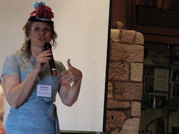 Heather McClenahan,Wearing her grandmother’s dress and a 1940s style hat, Los Alamos Historical Society Executive Director Heather McClanahan spoke of the history of the Oppenheimer House during Sunday’s Tea and Interpretive Planning Session. Photo by Carol A. Clark/ladailyposttest.ortizaudio.net