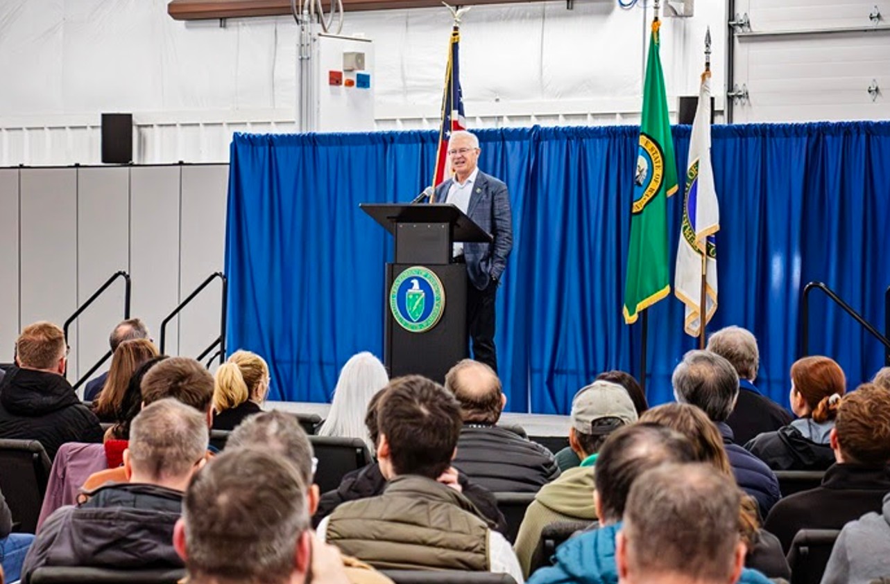 Assistant Secretary for the Office of Environmental Management Tim Walsh speaks with the Hanford workforce. Courtesy/DOE