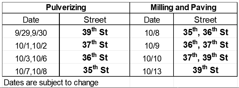 - The project area includes 35th Street, 36th Street, 37th Street, and 39th Street, which will be closed with local access only. 38th Street should be used as a detour throughout the duration of the project.