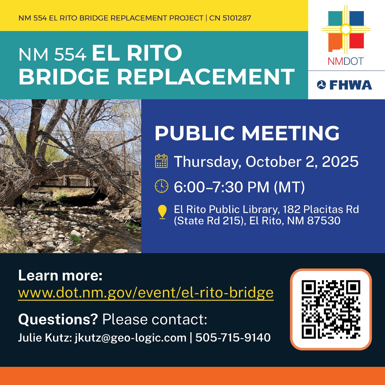 SANTA FE — The New Mexico Department of Transportation (NMDOT) is inviting the public to attend an in-person meeting to provide input on the NM 554 El Rito Bridge Replacement Project from 6–7:30 p.m., Thursday Oct. 2, 2025, at El Rito Public Library, 182 Placitas Rd (State Rd 215), El Rito, NM 87530.