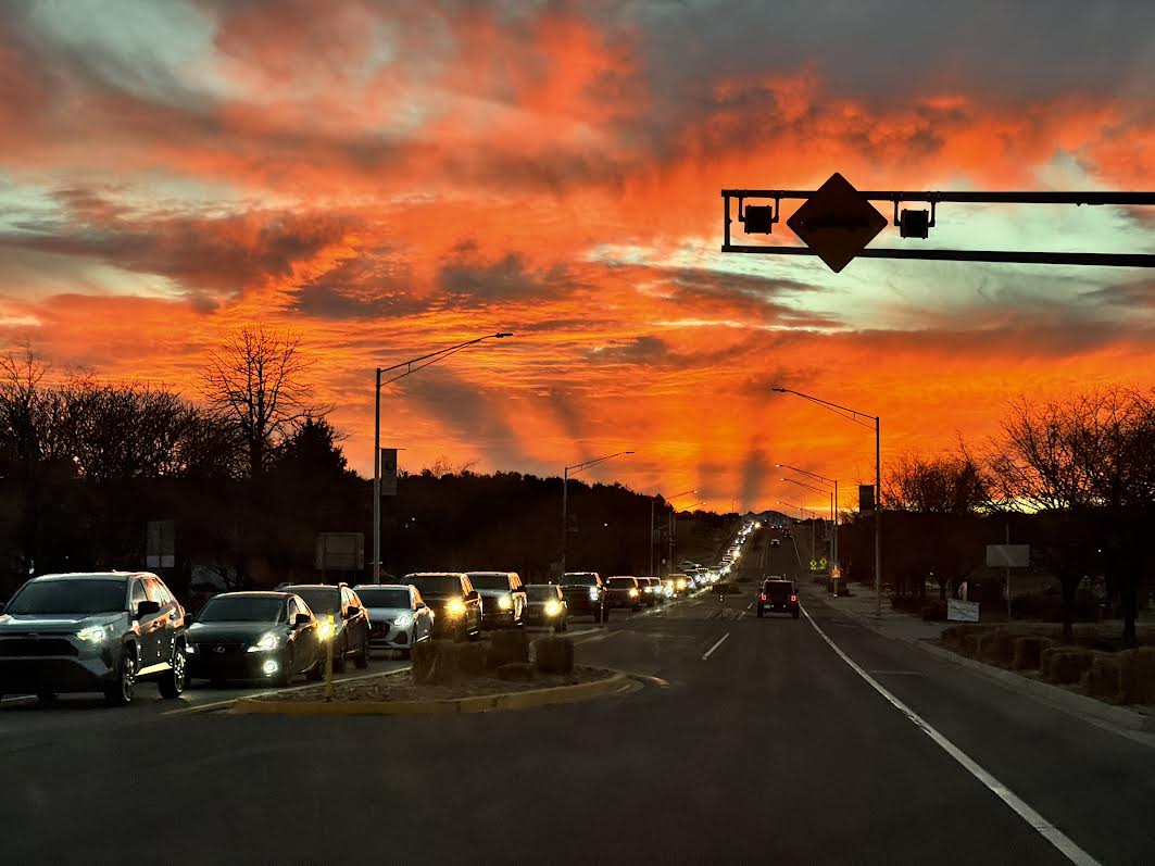 Daily Postcard: A dramatic sunset colors the sky as night begins to fall over a long line of commuters traveling along N.M. 4 on Wednesday in White Rock. Photo by Kirk Christensen Read More