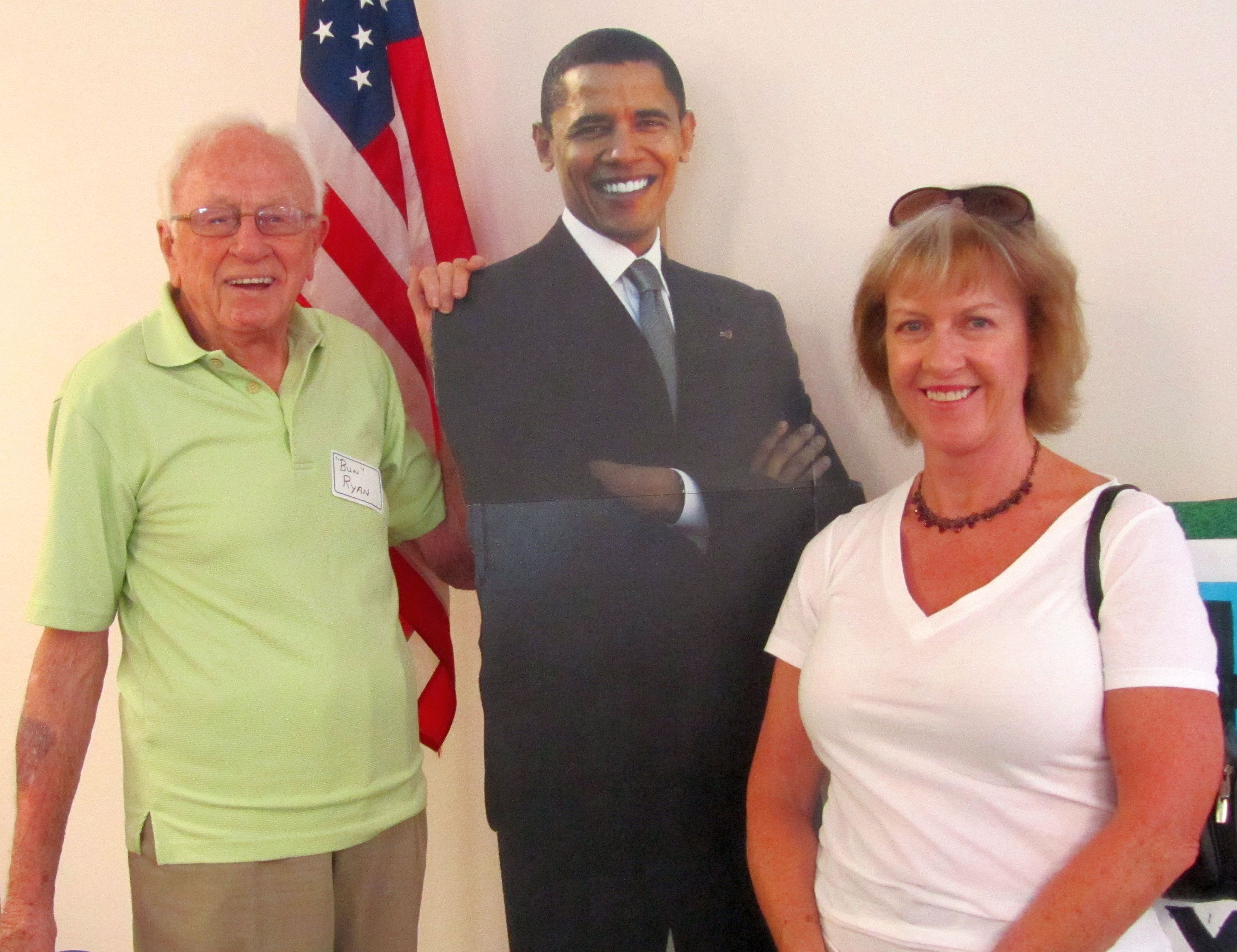 Los Alamos baseball legend Bun Ryan poses with a cardboard cutout of President Barack Obama and Maggie Charsley during Sunday’s grand opening event. The Democratic Party of Los Alamos County will now hold an open house noon-4 p.m. each Sunday at its new headquarters at 140 Central Park Square. The headquarters is now open Sunday through Friday noon to 8 p.m. and 10 a.m. to 6 p.m. Saturdays. Photo by Carol A. Clark/ladailyposttest.ortizaudio.net