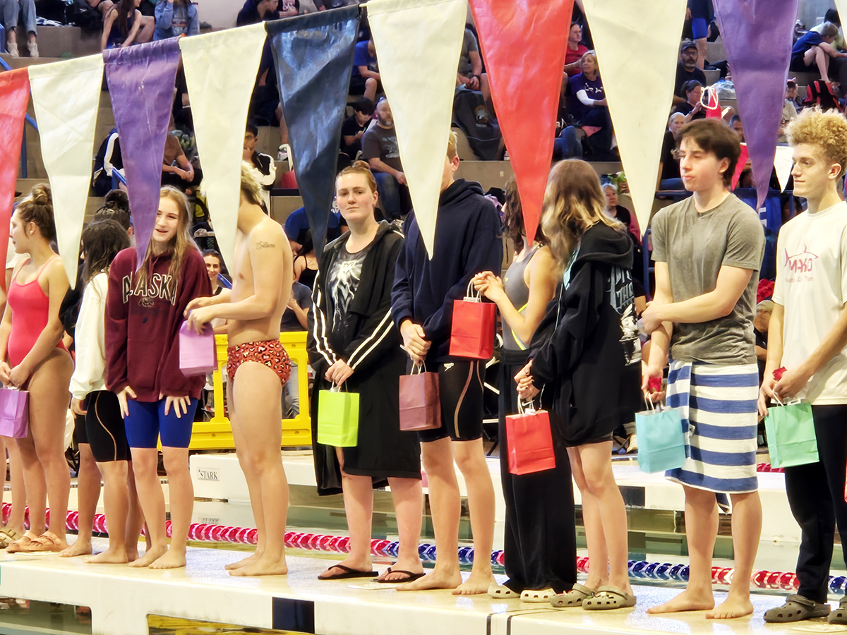 Madalyn Baily and other seniors receive recognition at the state meet. Courtesy/Los Alamos Aquatomics