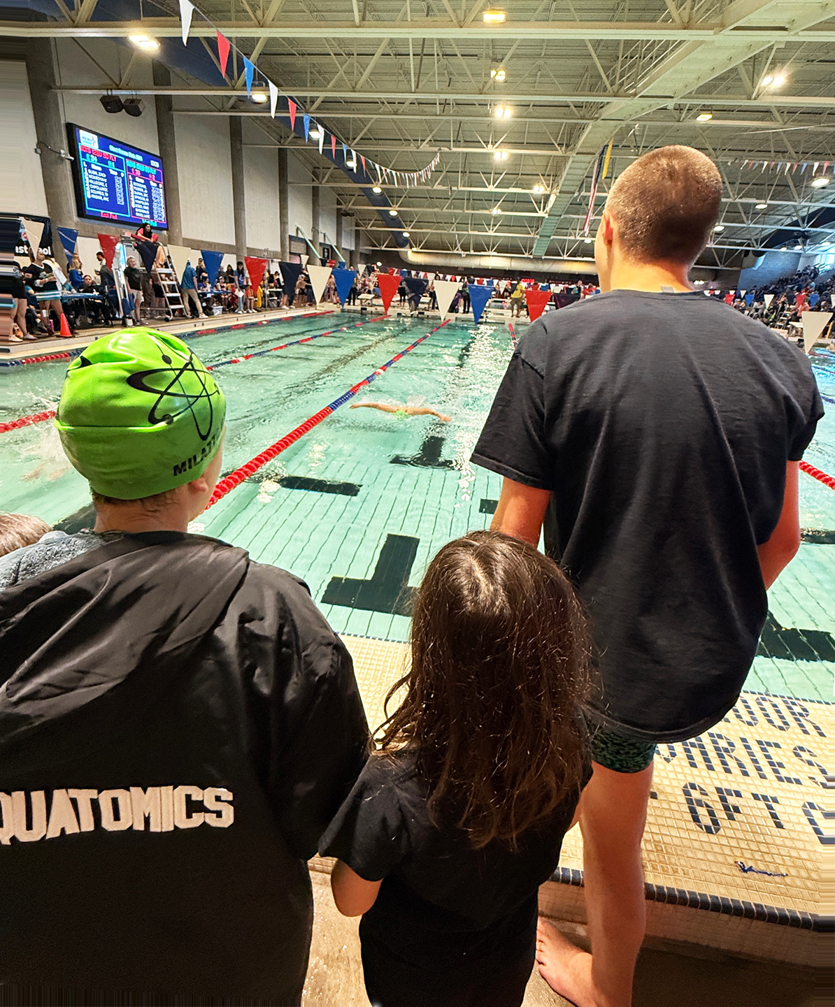 Teammates cheering Greyson Killgore on during his butterfly event. Courtesy/Los Alamos Aquatomics