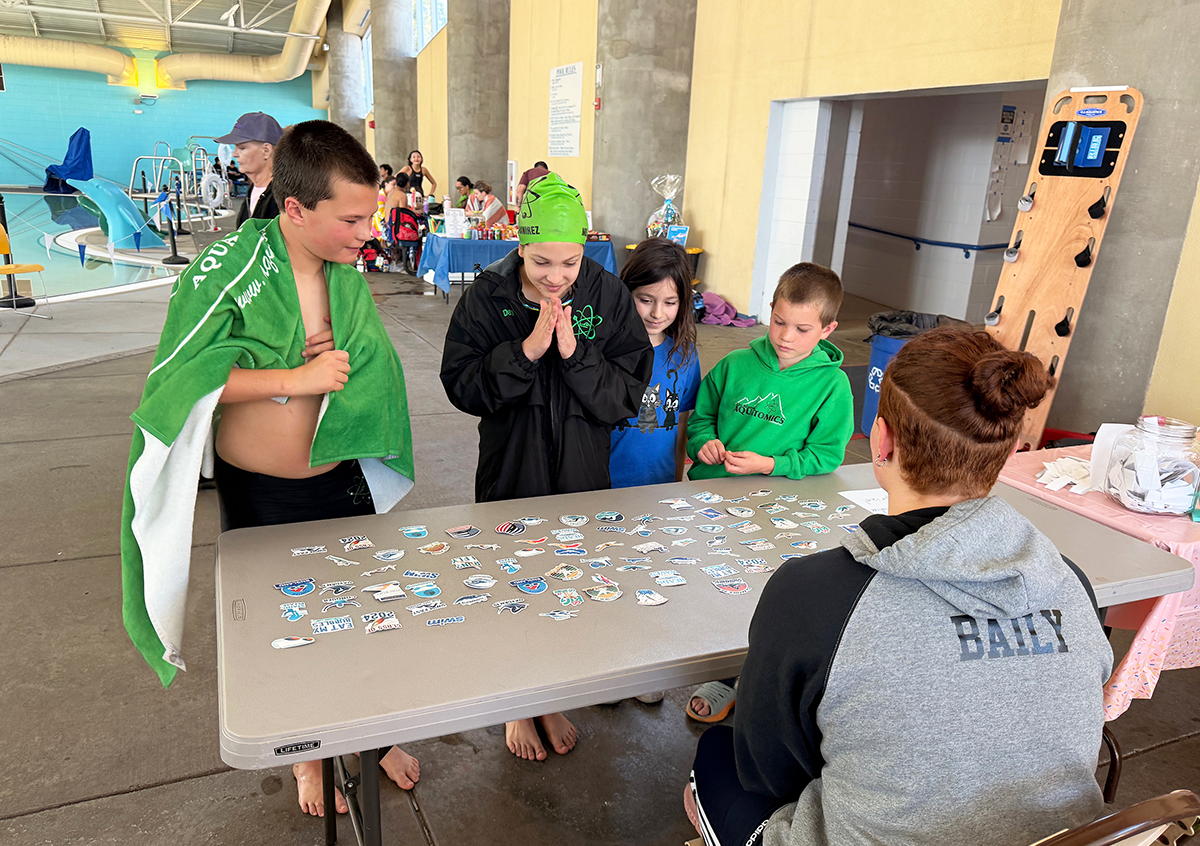 There’s always a moment to relax and grab some cool stickers at the State Championship. Courtesy/Los Alamos Aquatomics