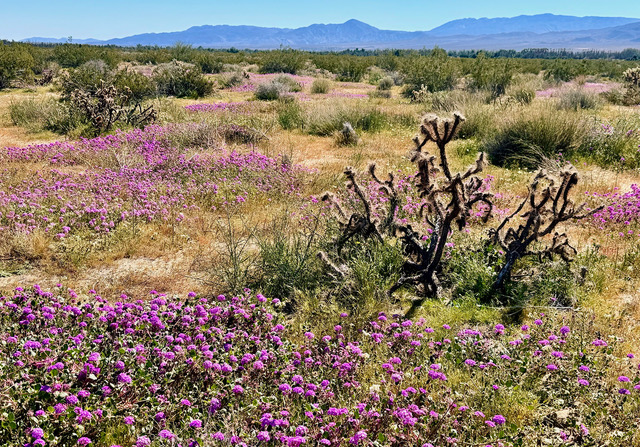 Cacti & Wildflowers: A tree cholla cactus stands surrounded by Desert Sand-verbena in a desert open space in Borrego Springs, Calif. The spring bloom was helped by the rains that fell over Southern California a few days ago. Any additional moisture will help extend the blooming season for a while longer. Photo by Gary Warren/ladailypost.com