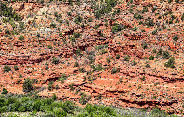Take A Hike: A stop at a popular viewpoint on Highway 12 allows visitors to stretch their legs and view the hikers on the Calf Creek Trail across the canyon. The trail and hikers are seen just above the green trees that grow along Calf Creek in the Canyon floor. Photo by Gary Warren/ladailypost.com