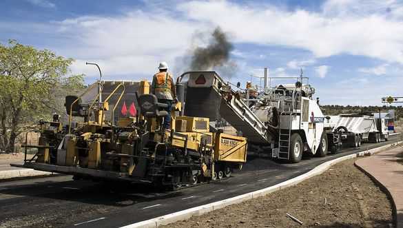 The yellow machine is the “lay-down” machine that places the hot asphalt mix on the road surface – this is the last machine in the line. The large white machine is the “shuttle buggy” whose job is to keep the “lay-down” machine supplied with hot asphalt mix. The dark cloud in the middle of the photograph is smoke from the hot asphalt (~340 degrees F) being dumped into the loading hopper on the front end of the “lay-down” machine. The “shuttle buggy” gets its asphalt from the bottom-dump semi trucks. On a good day, with a single line of roadway, this combination can lay up to 1,000 tons of asphalt material. Photo by TK Thompson/ladailypost.com