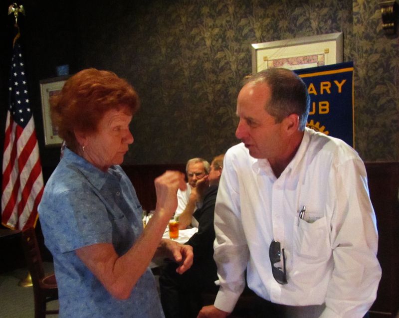 County Council candidate Steve Girrens speaks with Rotarian Linda Anderson. Photo by Carol A. Clark/ladailypost.com