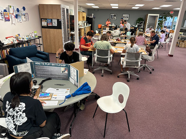 Zachary Morrell and Eliana Krakorvsky play Battleship using tools from the Manhattan Project era during the 2024 ScienceFest Discovery After Dark event, powered by Los Alamos MainStreet, Saturday night at projectY cowork Los Alamos in Central Park Square. Photo by Kirsten Laskey/ladailypost.com