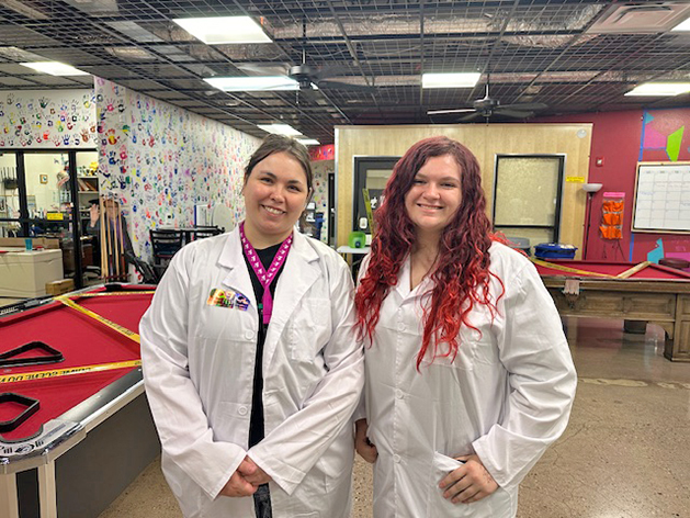 Someone committed a gruesome murder – but who? Teens Willow Golden, left, and Aspen Wakefield act as victims for the Teen Center’s murder mystery game during 2024 ScienceFest Discovery After Dark held Saturday around the downtown area. Using forensic science, participants attempt to solve the murders. Photo by Kirsten Laskey/ladailypost.com