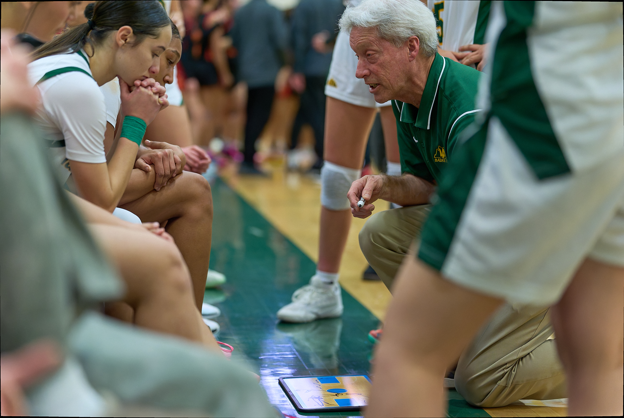 Hilltopper Head Coach Mike Kluk strategizes with the team during a late game timeout in the 4th quarter. Photo by Nate Limback/ladailypost.com