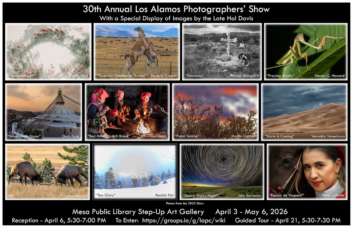 The Los Alamos Photo Club (LAPC) announces their annual photo show, Friday April 3 through Wednesday May 6, in Step Up Gallery on the upper level of the Mesa Public Library.
