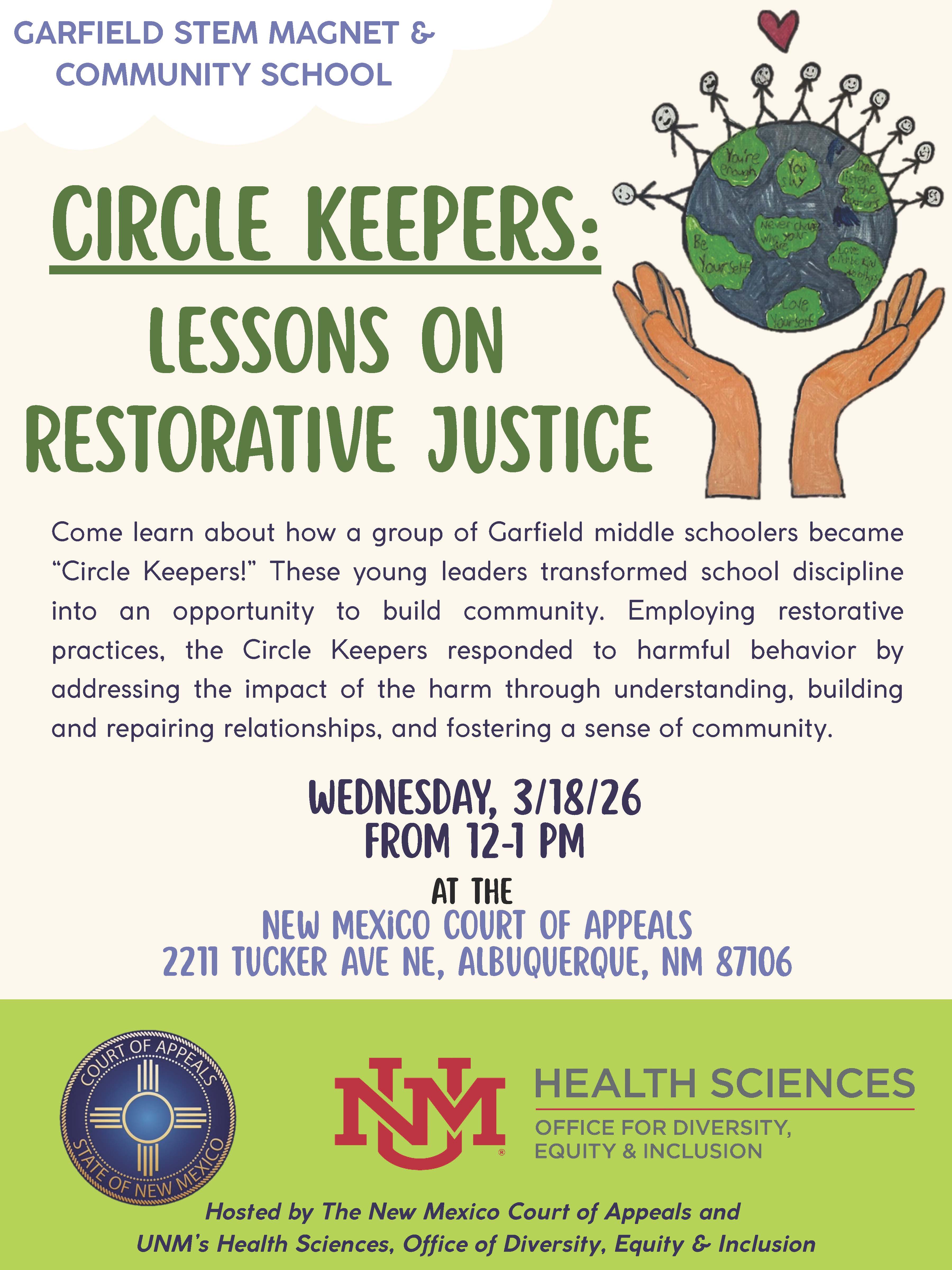 About 20 students in the Circle Keepers program at Garfield STEM Magnet and Community Middle School will display their art from noon to 1 p.m., Wednesday, March 18, in the foyer of the Court of Appeals Building, which is next to the University of New Mexico School of Law.