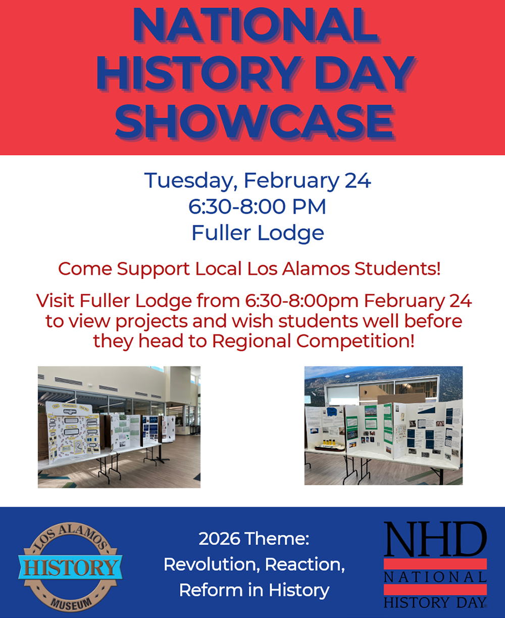 The Los Alamos Historical Society invites the community to a National History Day Showcase from 6:30-8 p.m. on Tuesday, Feb. 24 at Fuller Lodge.