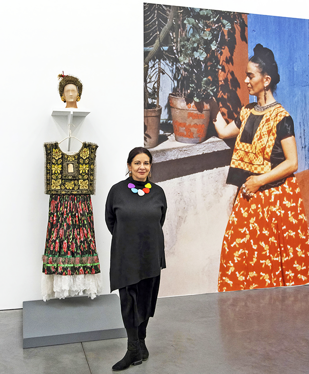Photographer Cristina Kahlo, in front of an image of her great-grandaunt Frida Kahlo, will give a lecture on Contemporary Mexican Photography Aug. 6 at Santa Fe Community College. Courtesy/SFCC