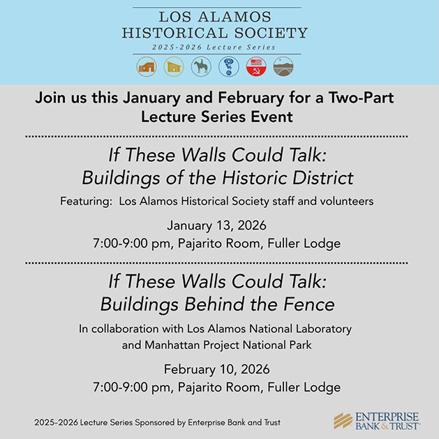 The Los Alamos Historical Society announces its upcoming free lectures 7-9 p.m. Tuesday, Jan. 13, and